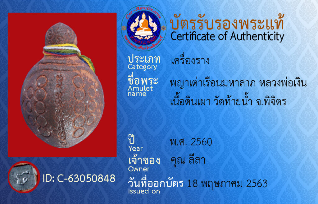 ชื่อพระ : พญาเต่าเรือนมหาลาภ หลวงพ่อเงิน เนื้อดินเผา วัดท้ายน้ำ จ.พิจิตร