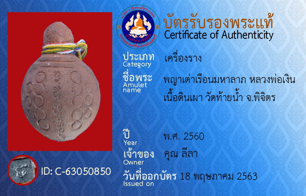ชื่อพระ : พญาเต่าเรือนมหาลาภ หลวงพ่อเงิน เนื้อดินเผา วัดท้ายน้ำ จ.พิจิตร