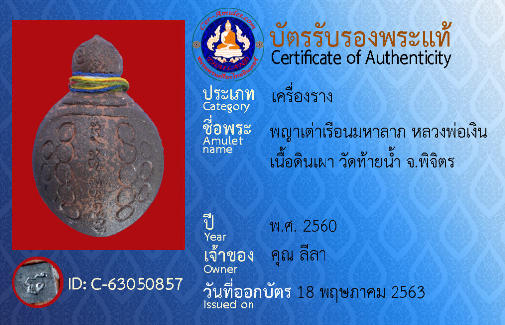 ชื่อพระ : พญาเต่าเรือนมหาลาภ หลวงพ่อเงิน เนื้อดินเผา วัดท้ายน้ำ จ.พิจิตร