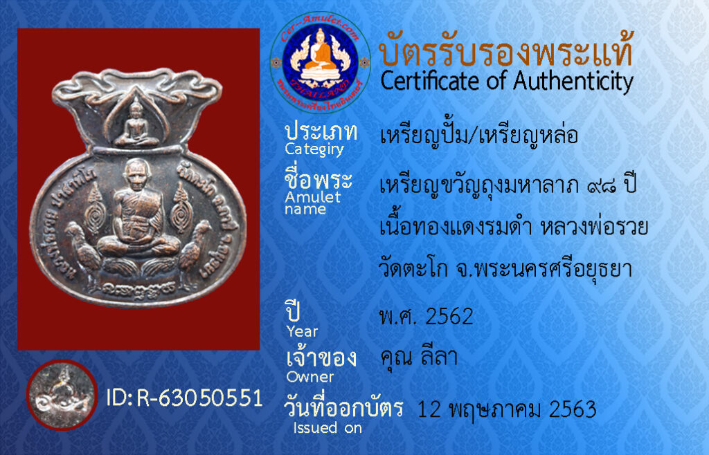 ชื่อพระ : เหรียญขวัญถุงมหาลาภ ๙๘ ปี เนื้อทองแดงรมดำ หลวงพ่อรวย วัดตะโก จ.พระนครศรีอยุธยา