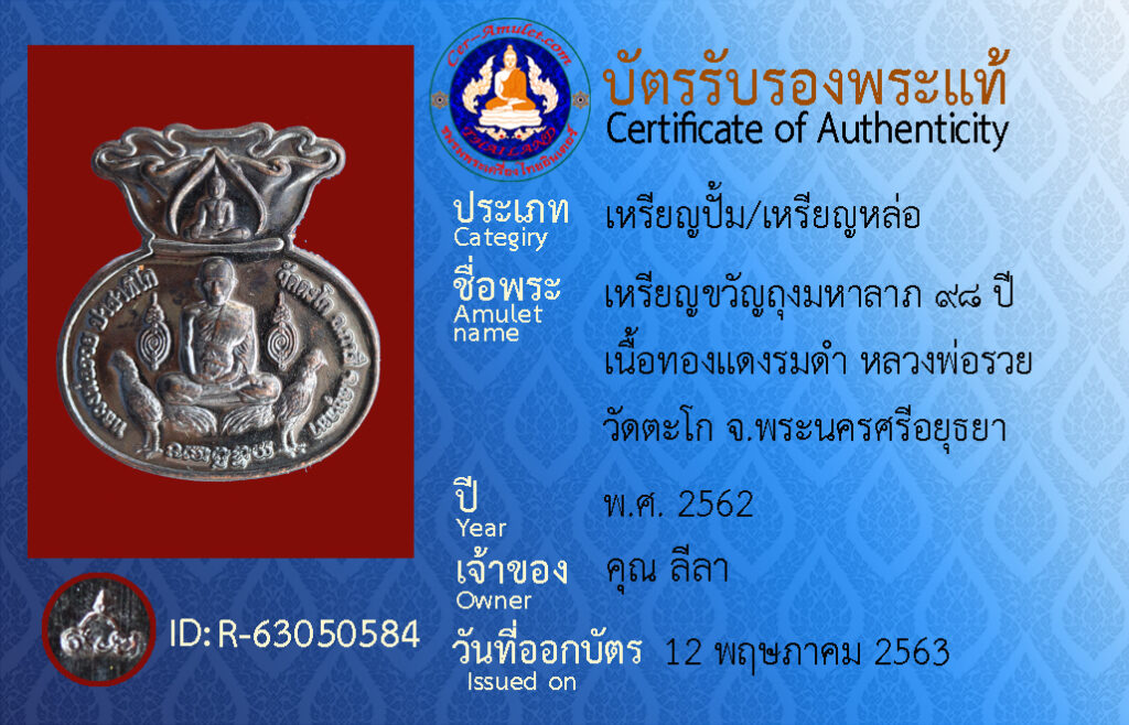 ชื่อพระ : เหรียญขวัญถุงมหาลาภ ๙๘ ปี เนื้อทองแดงรมดำ หลวงพ่อรวย วัดตะโก จ.พระนครศรีอยุธยา