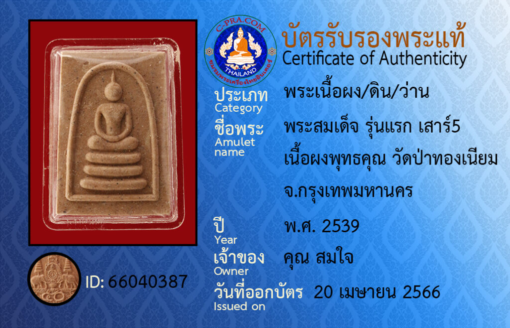 Amulet name : Prasomdet, Run raek sao5, Neua pongputtakun, Watpatongniam, Bangkok.