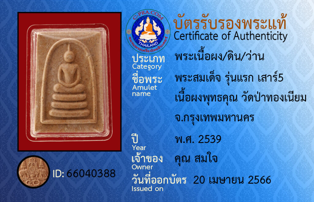 Amulet name : Prasomdet, Run raek sao5, Neua pongputtakun, Watpatongniam, Bangkok.