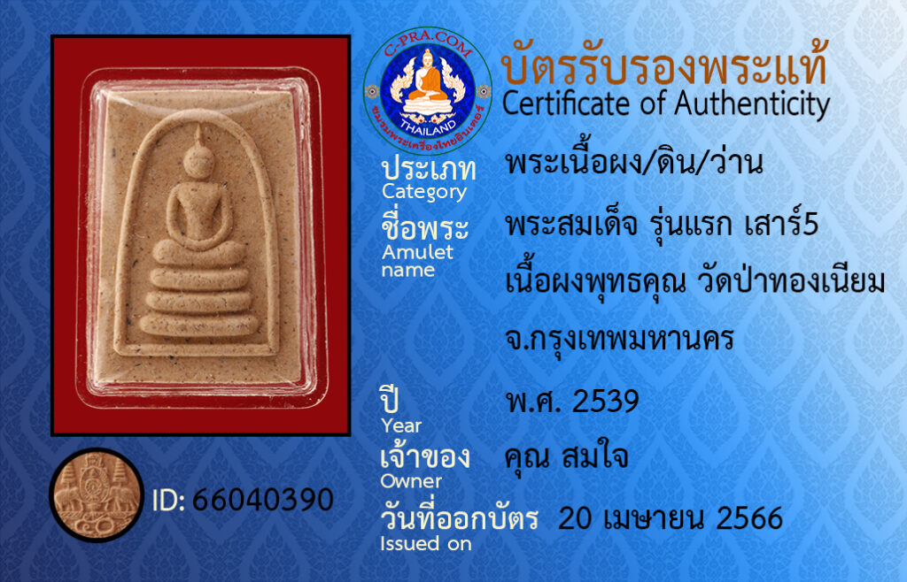 Amulet name : Prasomdet, Run raek sao5, Neua pongputtakun, Watpatongniam, Bangkok.