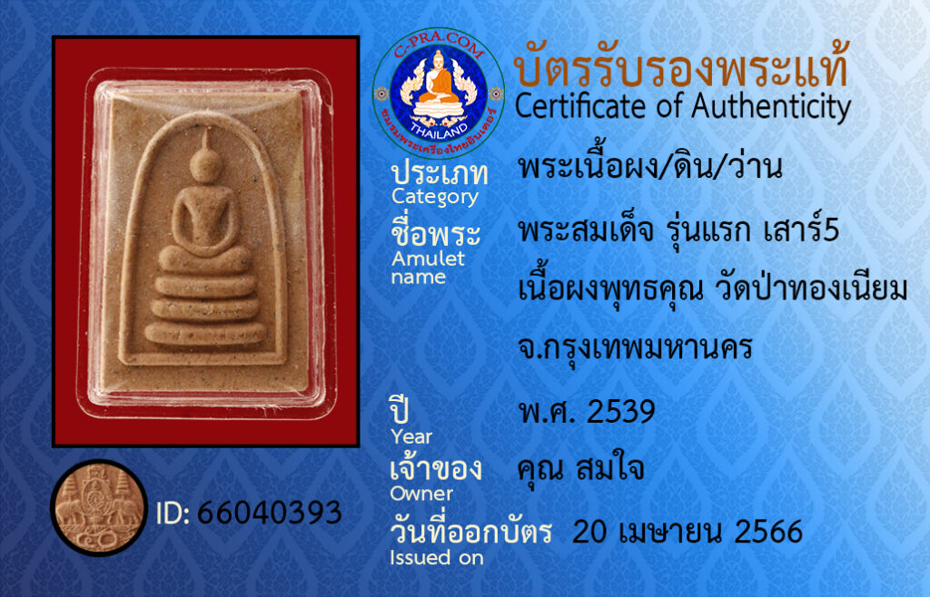 Amulet name : Prasomdet, Run raek sao5, Neua pongputtakun, Watpatongniam, Bangkok.