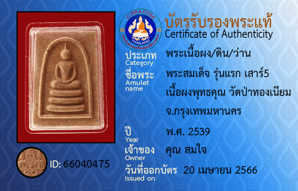 Amulet name : Prasomdet, Run raek sao5, Neua pongputtakun, Watpatongniam, Bangkok.