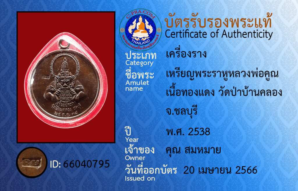 Amulet name : Rian Prarahoo Luangpor Koon, Neua tongdaeng,Watpabanklong,Chonburi.