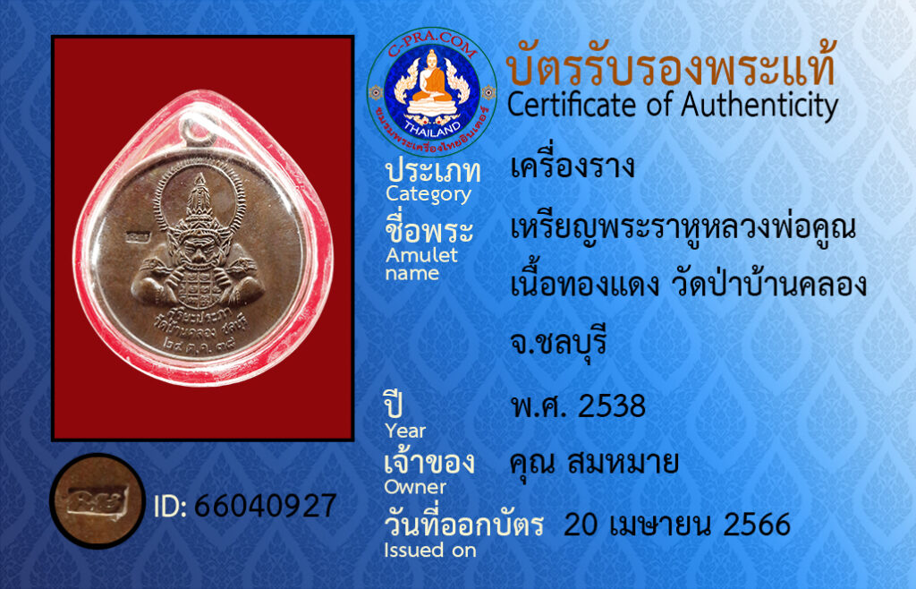 ชื่อพระ :เหรียญพระราหูหลวงพ่อคูณ เนื้อทองแดง วัดป่าบ้านคลอง จ.ชลบุรี