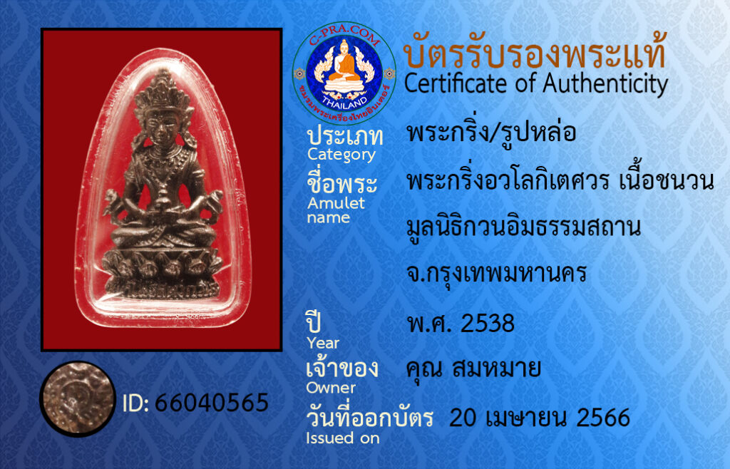 ชื่อพระ :พระกริ่งอวโลกิเตศวร เนื้อชนวน มูลนิธิกวนอิมธรรมสถาน จ.กรุงเทพมหานคร