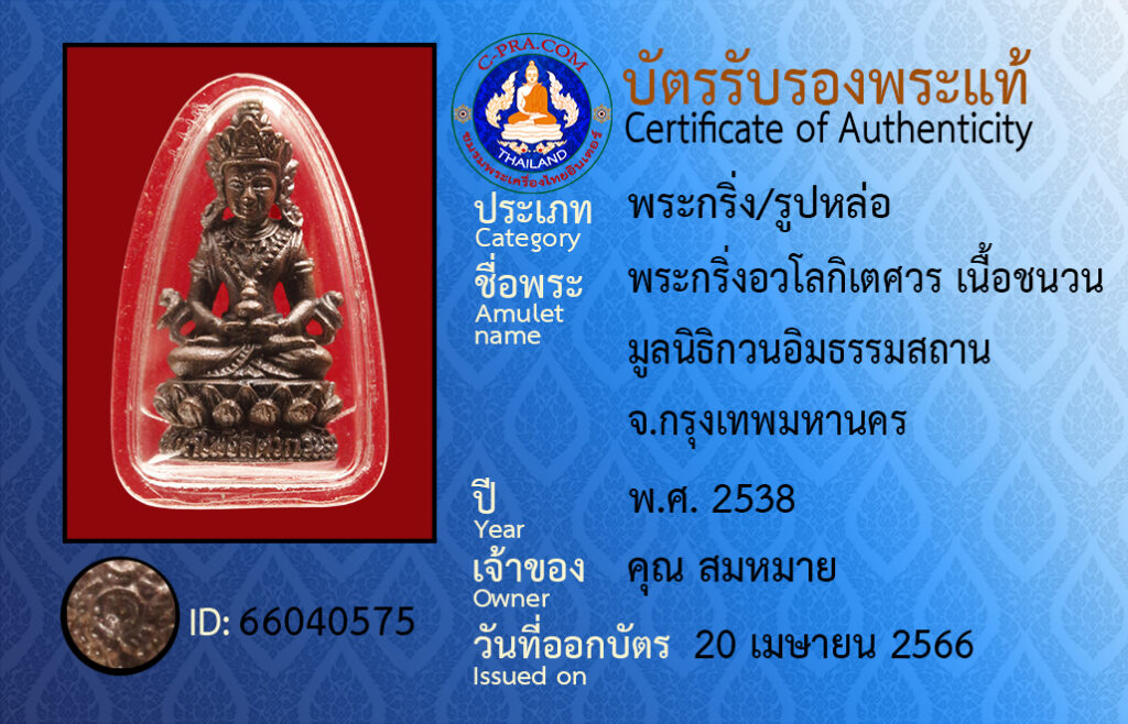 ชื่อพระ :พระกริ่งอวโลกิเตศวร เนื้อชนวน มูลนิธิกวนอิมธรรมสถาน จ.กรุงเทพมหานคร