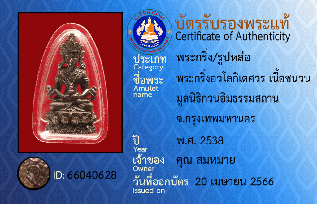 ชื่อพระ :พระกริ่งอวโลกิเตศวร เนื้อชนวน มูลนิธิกวนอิมธรรมสถาน จ.กรุงเทพมหานคร