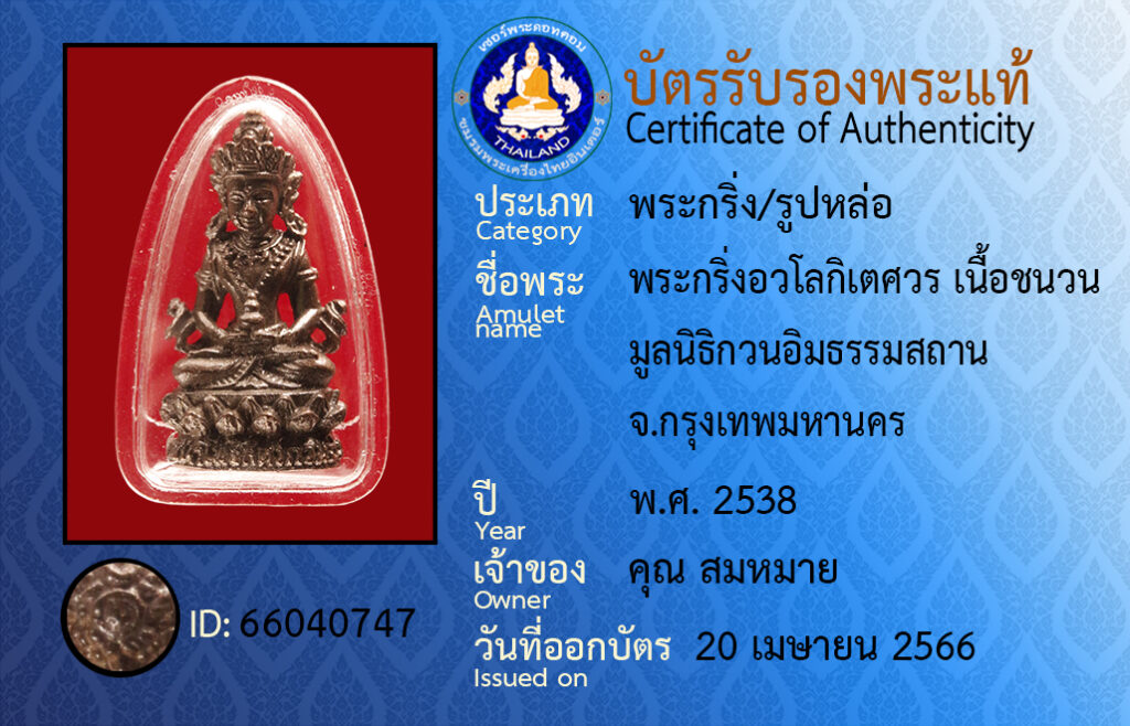 ชื่อพระ :พระกริ่งอวโลกิเตศวร เนื้อชนวน มูลนิธิกวนอิมธรรมสถาน จ.กรุงเทพมหานคร