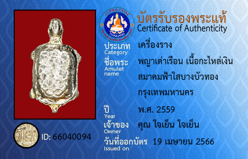ชื่อพระ : พญาเต่าเรือน เนื้อกะไหล่เงิน สมาคมฟ้าใสบางบัวทอง จ.กรุงเทพมหานคร