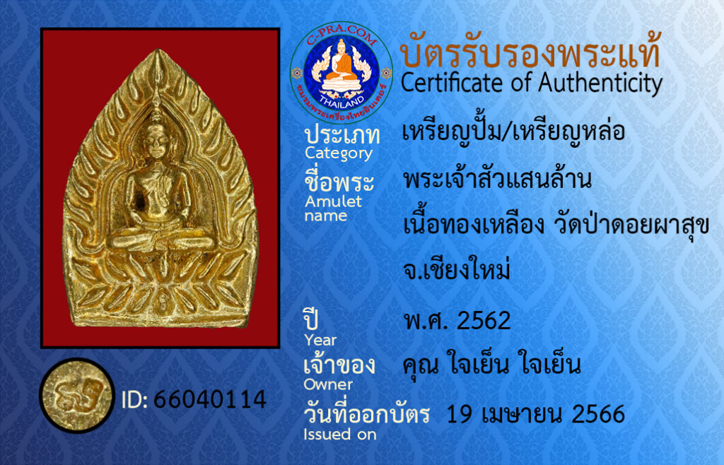 ชื่อพระ :พระเจ้าสัวแสนล้าน เนื้อทองเหลือง วัดป่าดอยผาสุก จ.เชียงใหม่