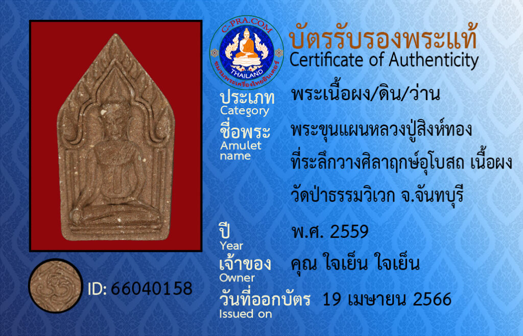 ชื่อพระ :พระขุนแผน หลวงปู่สิงห์ทอง ที่ระลึกวางศิลาฤกษ์อุโบสถ เนื้อผง วัดป่าธรรมวิเวก จ.จันทบุรี