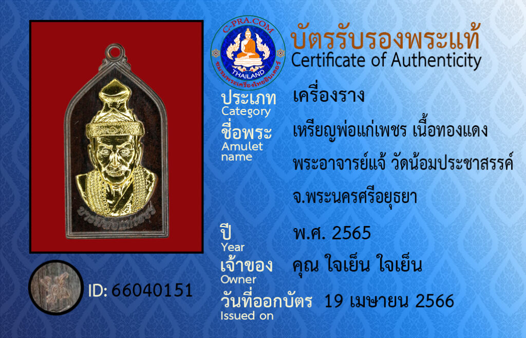 Amulet name :rian por kae pet neuatongdang pra-a-jran jae wat nompachasan pranakhonsee a- yut ta ya