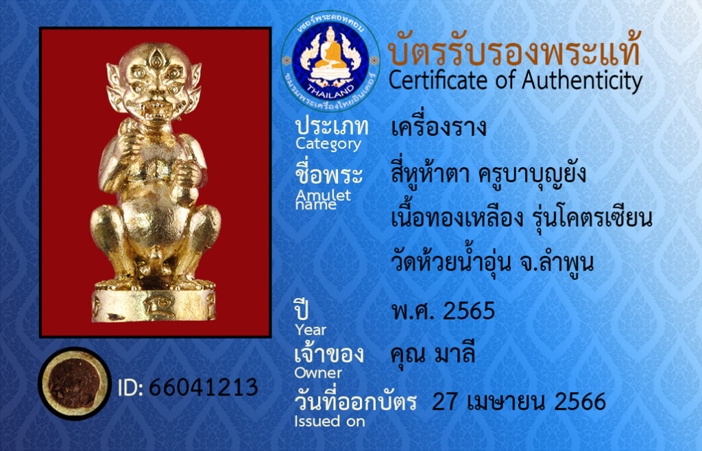 Amulet name : name : see hoo ha ta kroobabunyang neuatongleuang runkotsian wathuaynam- un Lampoon