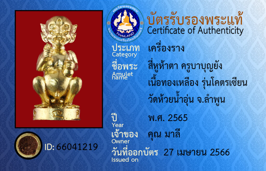 Amulet name : name : see hoo ha ta kroobabunyang neuatongleuang runkotsian wathuaynam- un Lampoon