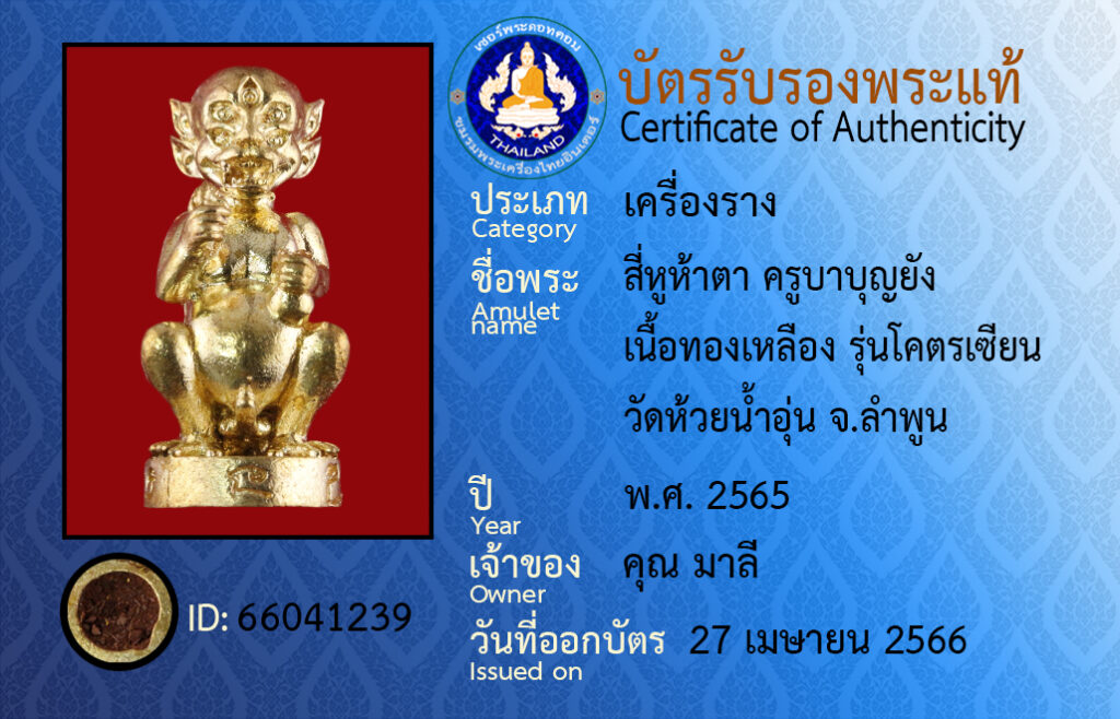 Amulet name : name : see hoo ha ta kroobabunyang neuatongleuang runkotsian wathuaynam- un Lampoon