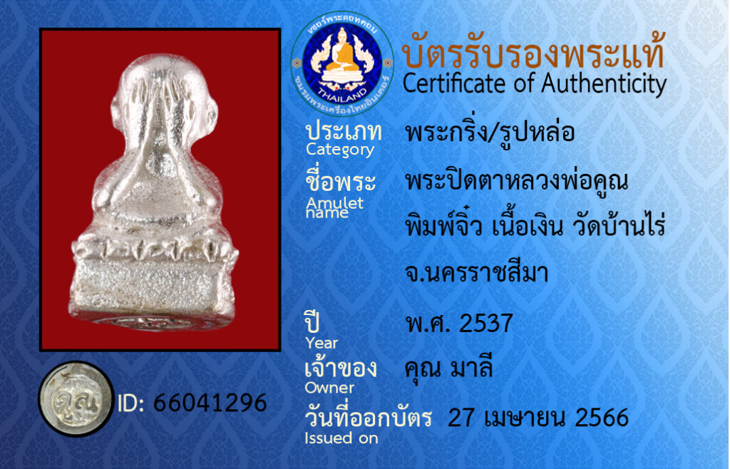 Amulet name : name : Phra pid ta luang por koon pim jiw neuangern wat ban rai na kon rat see ma