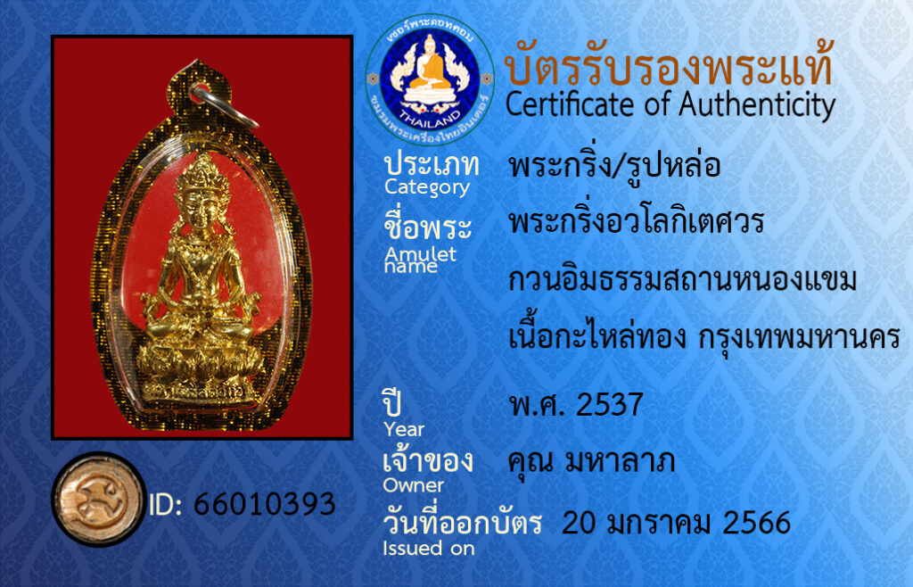 ชื่อพระ : พระกริ่งอวโลกิเตศวร กวนอิมธรรมสถานหนองเเขม เนื้อกะไหล่ทอง กรุงเทพมหานคร
