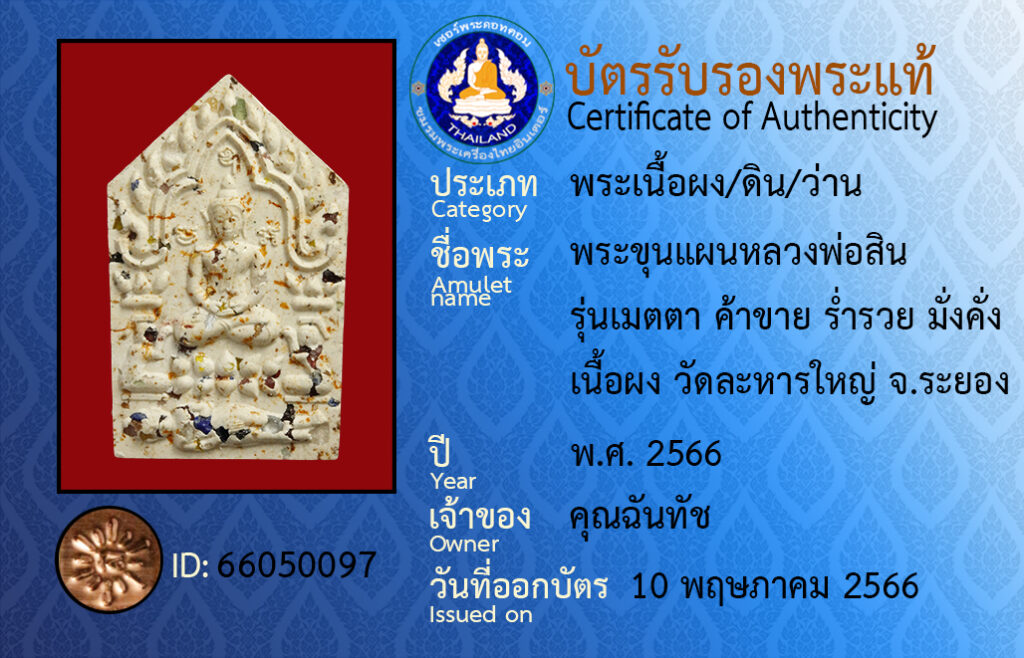 ชื่อพระ : พระขุนแผนหลวงพ่อสิน รุ่นเมตตา ค้าขาย ร่ำรวย มั่งคั่ง เนื้อผง วัดละหารใหญ่ จ.ระยอง