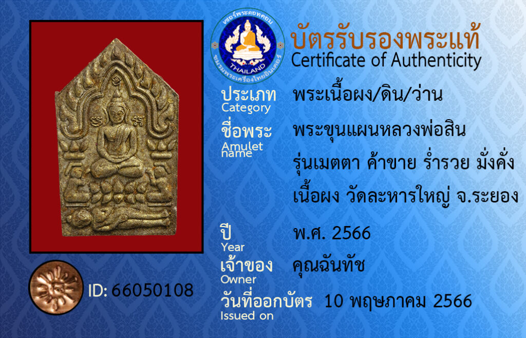 ชื่อพระ : พระขุนแผนหลวงพ่อสิน รุ่นเมตตา ค้าขาย ร่ำรวย มั่งคั่ง เนื้อผง วัดละหารใหญ่ จ.ระยอง
