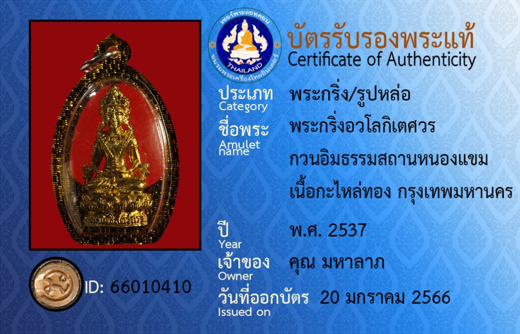 ชื่อพระ : พระกริ่งอวโลกิเตศวร กวนอิมธรรมสถานหนองเเขม เนื้อกะไหล่ทอง กรุงเทพมหานคร