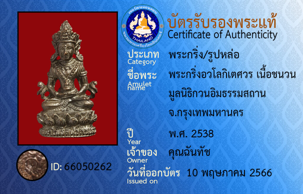 ชื่อพระ :พระกริ่งอวโลกิเตศวร เนื้อชนวน มูลนิธิกวนอิมธรรมสถาน จ.กรุงเทพมหานคร