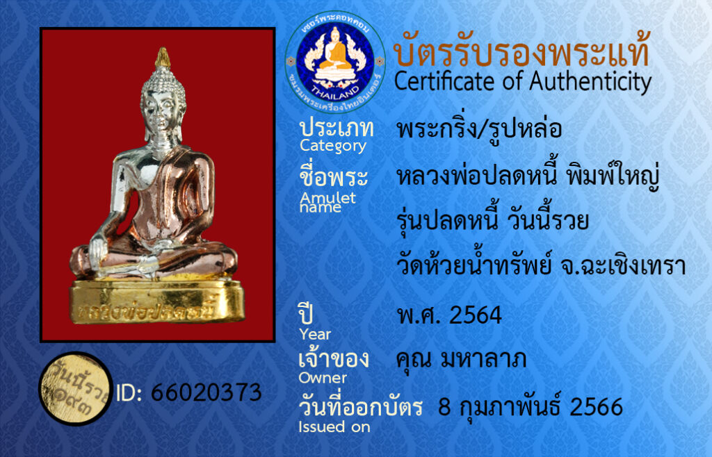 ชื่อพระ :หลวงพ่อปลดหนี้ พิมพ์ใหญ่ รุ่นปลดหนี้ วันนี้รวย วัดห้วยน้ำทรัพย์ จ.ฉะเชิงเทรา