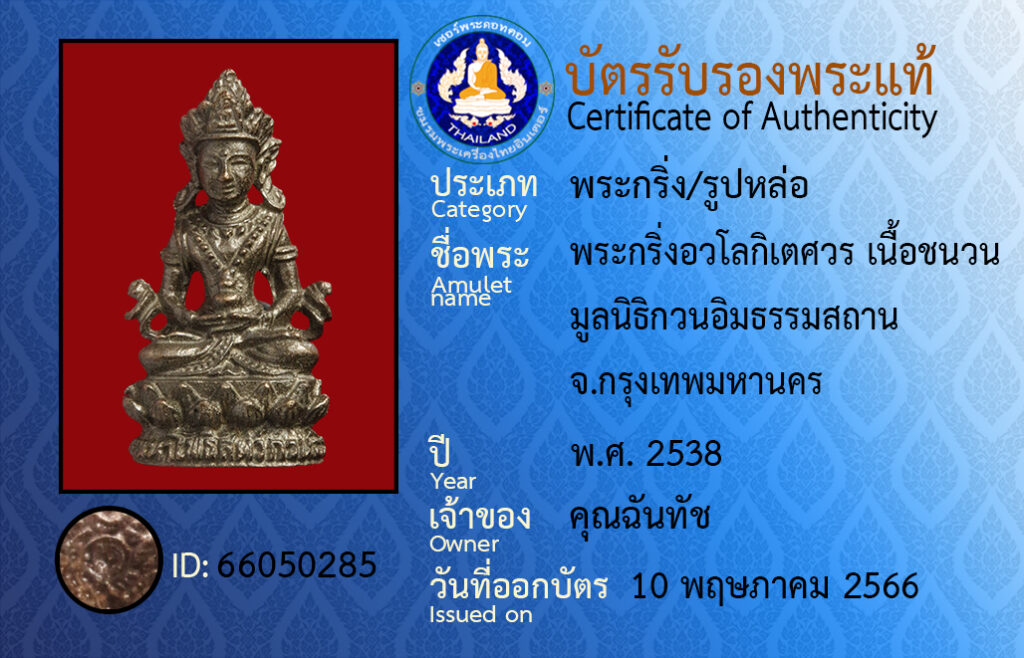 ชื่อพระ :พระกริ่งอวโลกิเตศวร เนื้อชนวน มูลนิธิกวนอิมธรรมสถาน จ.กรุงเทพมหานคร