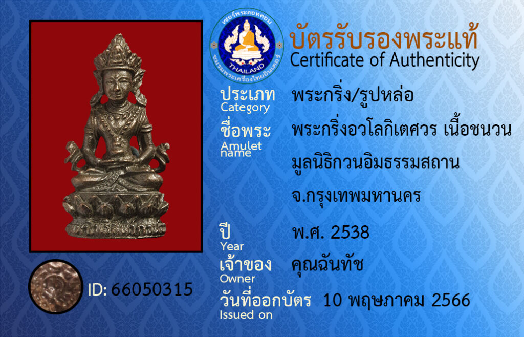 ชื่อพระ :พระกริ่งอวโลกิเตศวร เนื้อชนวน มูลนิธิกวนอิมธรรมสถาน จ.กรุงเทพมหานคร