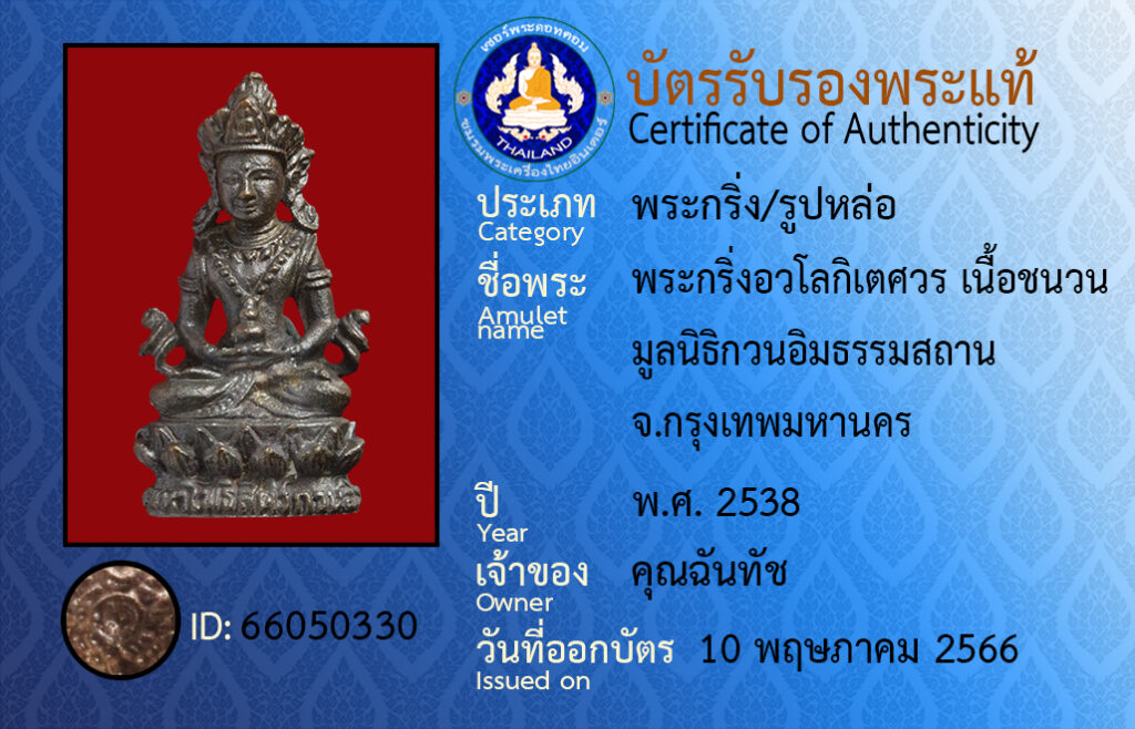 ชื่อพระ :พระกริ่งอวโลกิเตศวร เนื้อชนวน มูลนิธิกวนอิมธรรมสถาน จ.กรุงเทพมหานคร