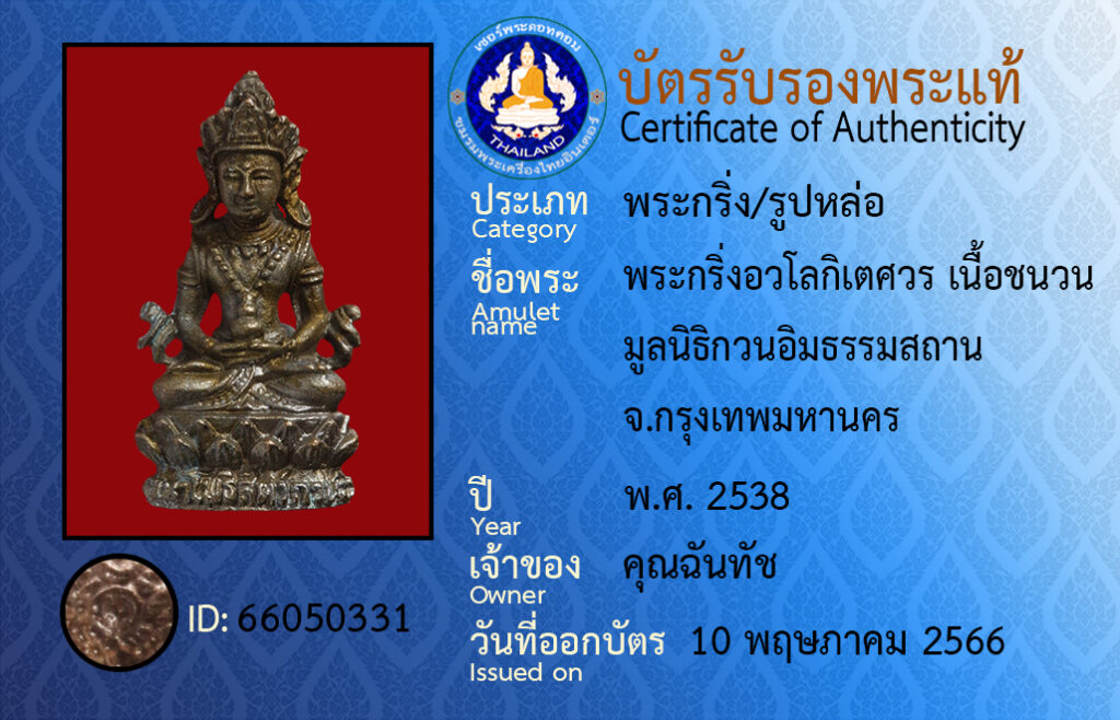 ชื่อพระ :พระกริ่งอวโลกิเตศวร เนื้อชนวน มูลนิธิกวนอิมธรรมสถาน จ.กรุงเทพมหานคร