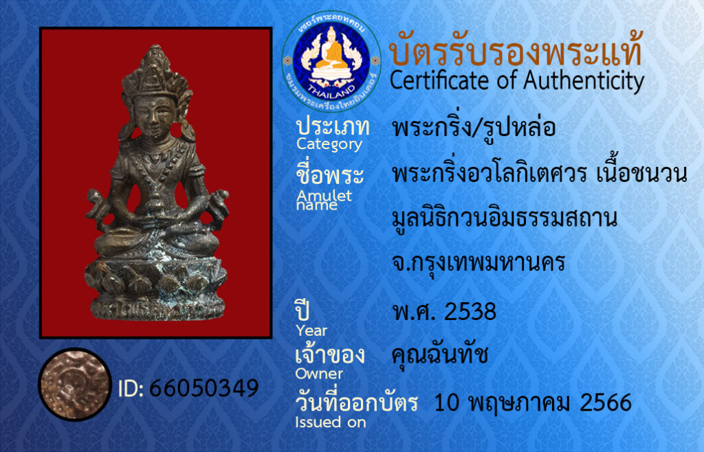 ชื่อพระ :พระกริ่งอวโลกิเตศวร เนื้อชนวน มูลนิธิกวนอิมธรรมสถาน จ.กรุงเทพมหานคร