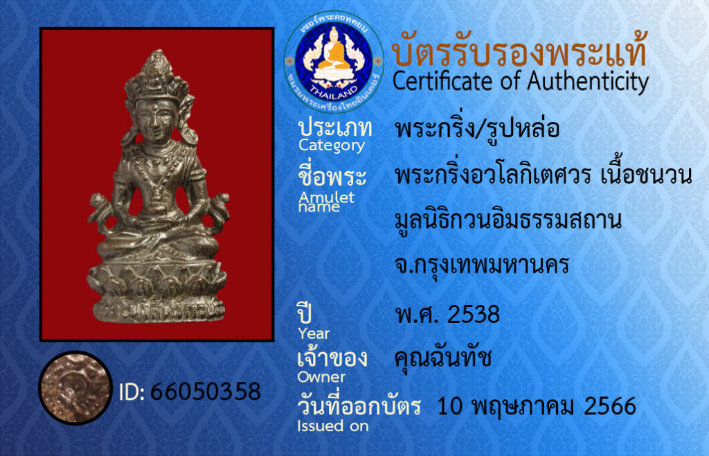 ชื่อพระ :พระกริ่งอวโลกิเตศวร เนื้อชนวน มูลนิธิกวนอิมธรรมสถาน จ.กรุงเทพมหานคร
