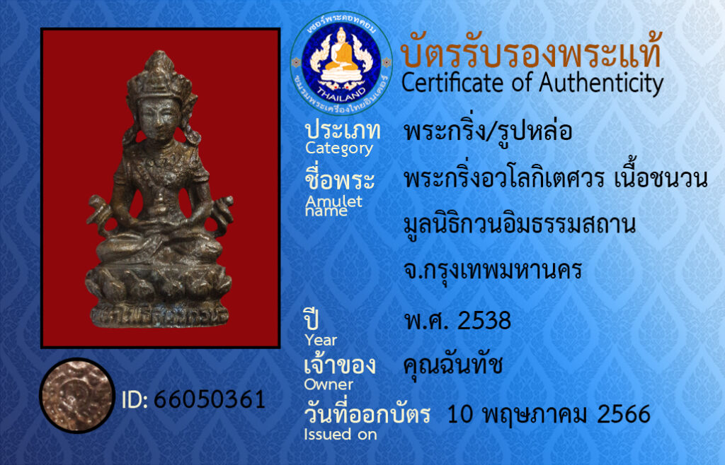 ชื่อพระ :พระกริ่งอวโลกิเตศวร เนื้อชนวน มูลนิธิกวนอิมธรรมสถาน จ.กรุงเทพมหานคร