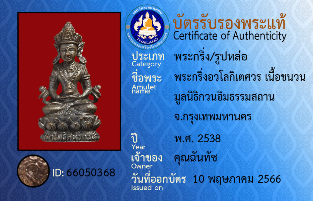 ชื่อพระ :พระกริ่งอวโลกิเตศวร เนื้อชนวน มูลนิธิกวนอิมธรรมสถาน จ.กรุงเทพมหานคร