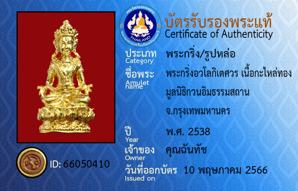 ชื่อพระ :พระกริ่งอวโลกิเตศวร เนื้อกะไหล่ทอง มูลนิธิกวนอิมธรรมสถาน จ.กรุงเทพมหานคร