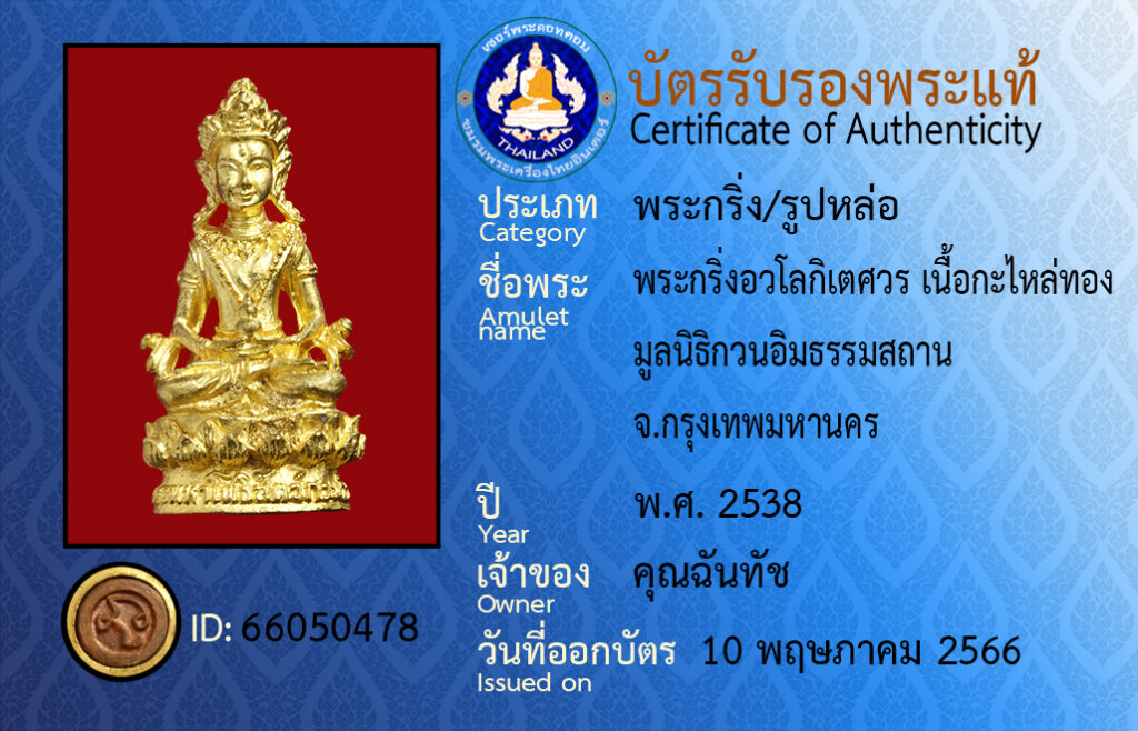 ชื่อพระ :พระกริ่งอวโลกิเตศวร เนื้อกะไหล่ทอง มูลนิธิกวนอิมธรรมสถาน จ.กรุงเทพมหานคร