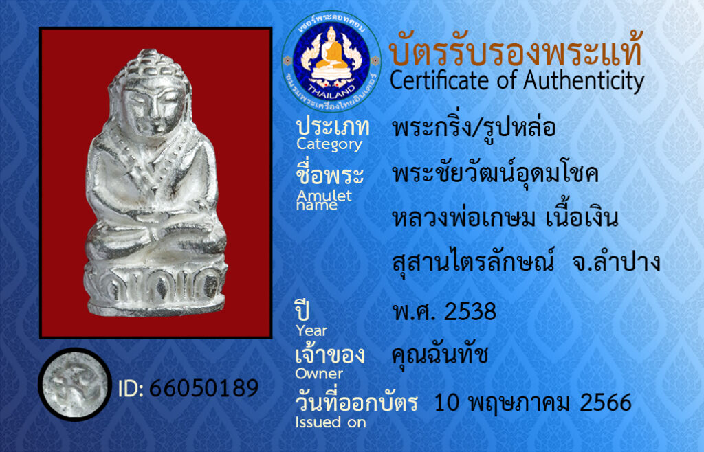 ชื่อพระ :พระชัยวัฒน์อุดมโชค หลวงพ่อเกษม เนื้อเงิน สุสานไตรลักษณ์ จ.ลำปาง