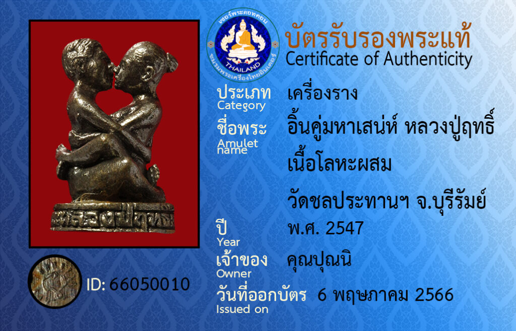 ชื่อพระ :อิ้นคู่มหาเสน่ห์ หลวงปู่ฤทธิ์ เนื้อโลหะผสม วัดชลประทานฯ จ.บุรีรัมย์