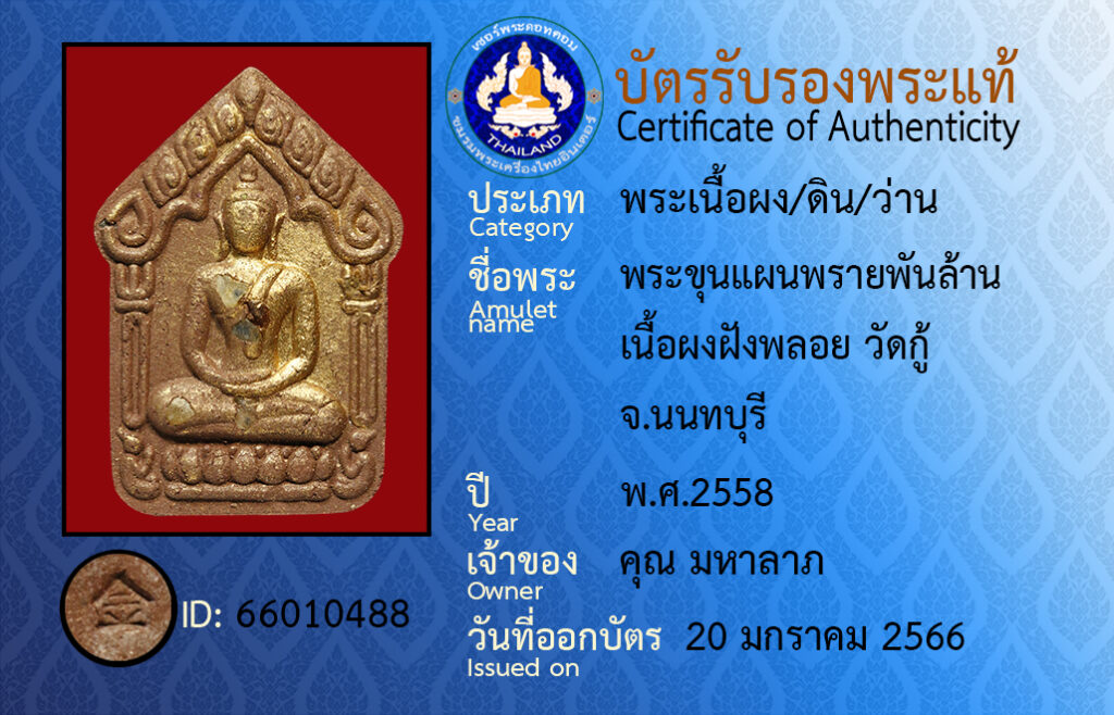 ชื่อพระ : พระขุนเเผนพรายพันล้าน เนื้อผงฝังพลอย วัดกู้ จ.นนทบุรี