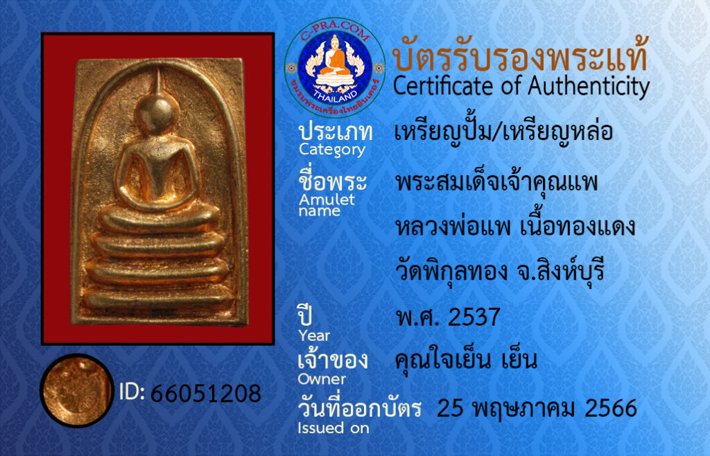 ชื่อพระ :พระสมเด็จเจ้าคุณแพ หลวงพ่อแพ เนื้อทองแดง วัดพิกุลทอง จ.สิงห์บุรี
