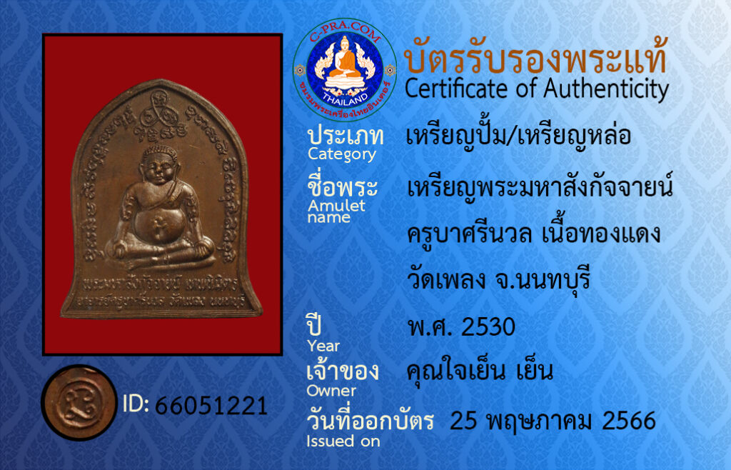 Amulet name : rian pra ma-ha sang-gat-jai kroo bra see nuan neua tong daeng wat-pleng Non-ta-bu-ree