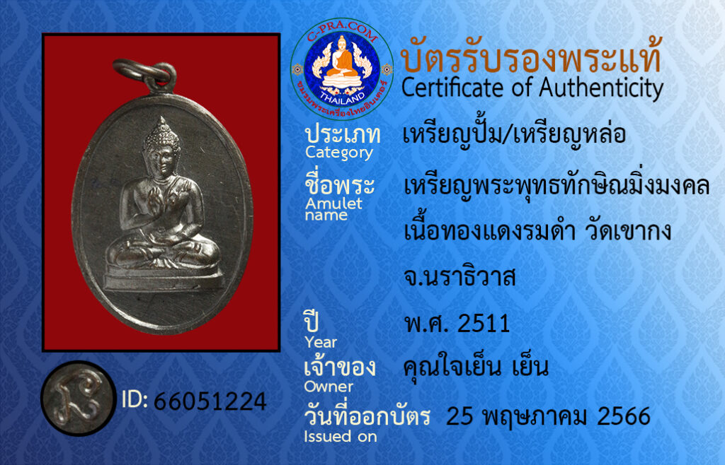 ชื่อพระ :เหรียญพระพุทธทักษิณมิ่งมงคล เนื้อทองแดงรมดำ วัดเขากง จ.นราธิวาส