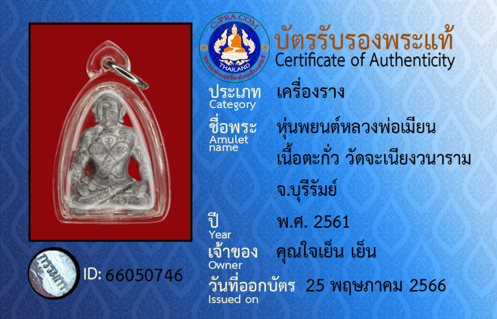 Amulet name : Hun-pa-yon luang por miian · neuua dta-gua · wat ja-niiang wa-naa-raam Buri Ram