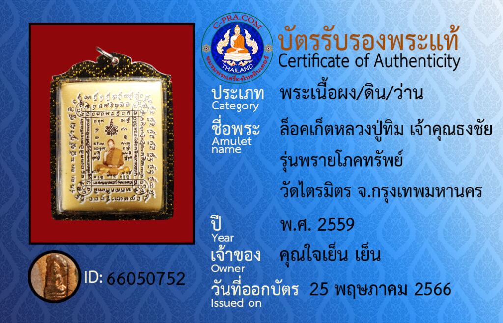 Amulet name : lok grt luuang poo tim · jao kun tong chai · run praai pohk-ka-sap · wat dtrai mit Bangkok