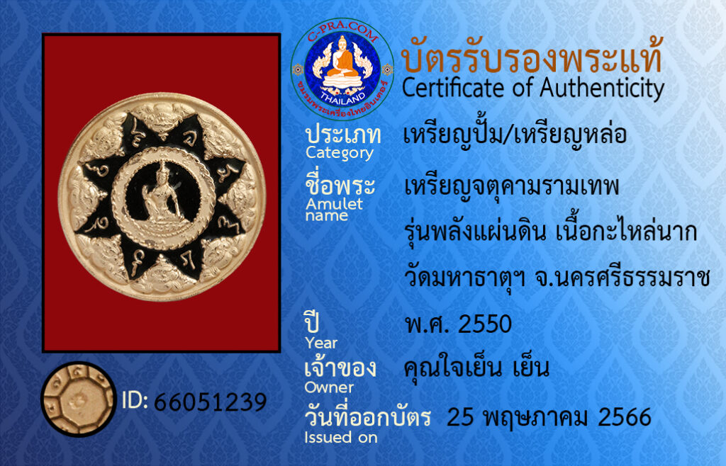 ชื่อพระ :เหรียญจตุคามรามเทพ รุ่นพลังแผ่นดิน เนื้อกะไหล่นาก วัดมหาธาตุฯ จ.นครศรีธรรมราช