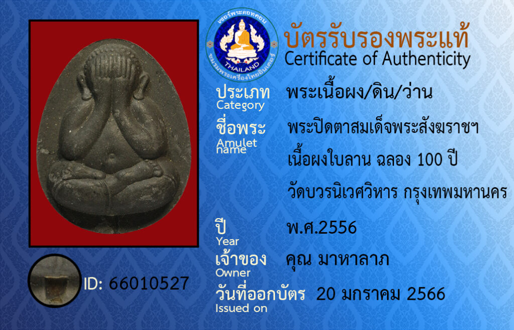 ชื่อพระ : พระปิดตาสมเด็จพระสังฆราชฯ เนื้อผงใบลาน ฉลอง100ปี วัดบวรนิเวศวรวิหาร กรุงเทพมหานคร